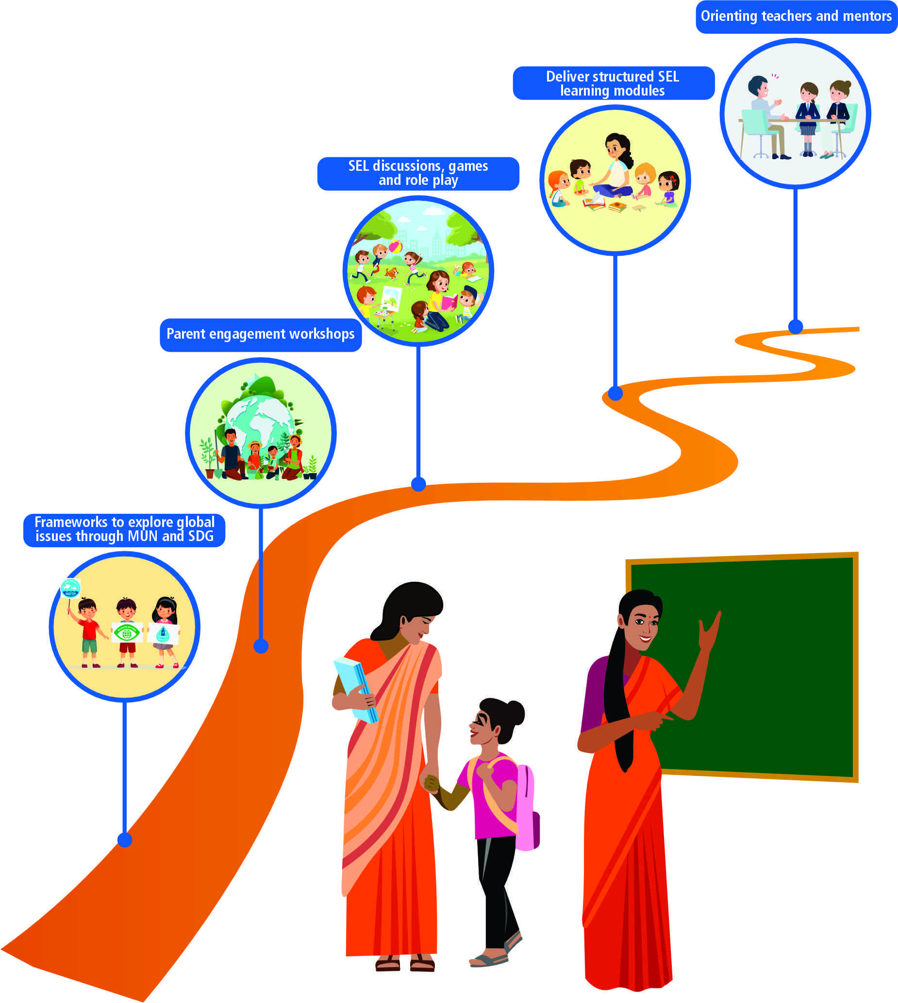 The Programme blends structured everyday interactive activities, reflective practices, games and a rich array of curated resources to engage and support students, parents, mentors and school systems in fostering SEL spaces in school, home and the community.